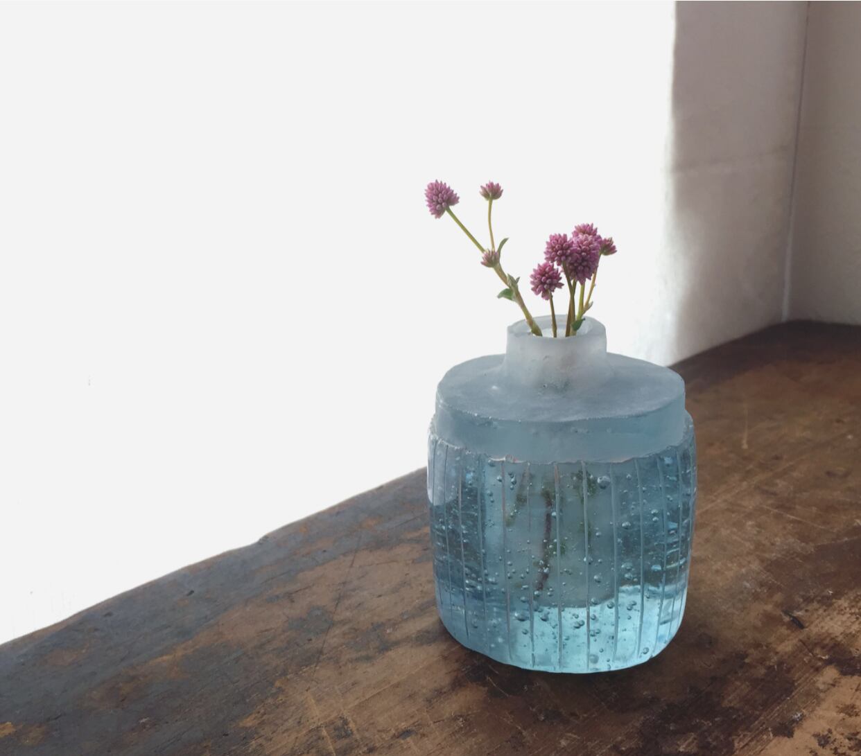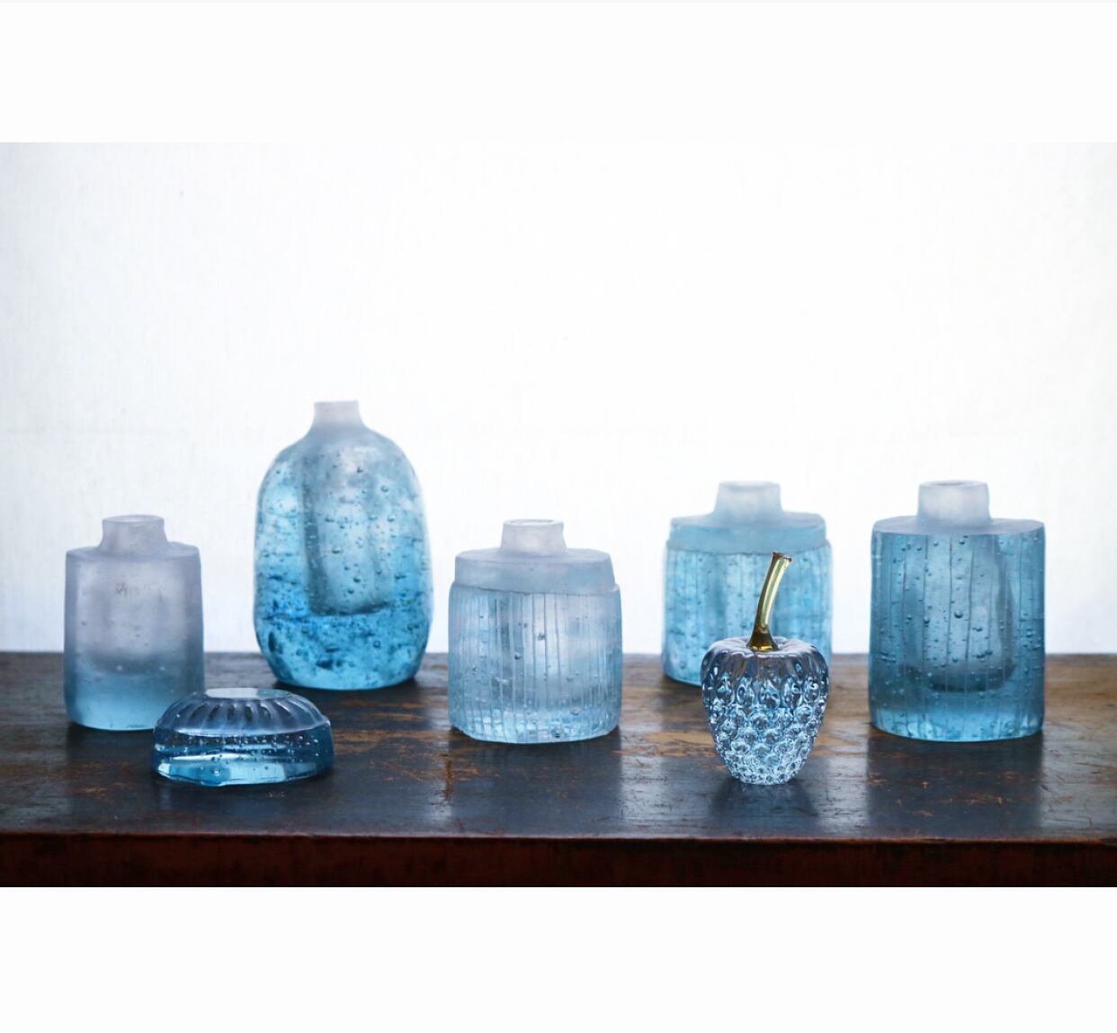 瑞々しい静かなトーンの青が印象的な花器です。