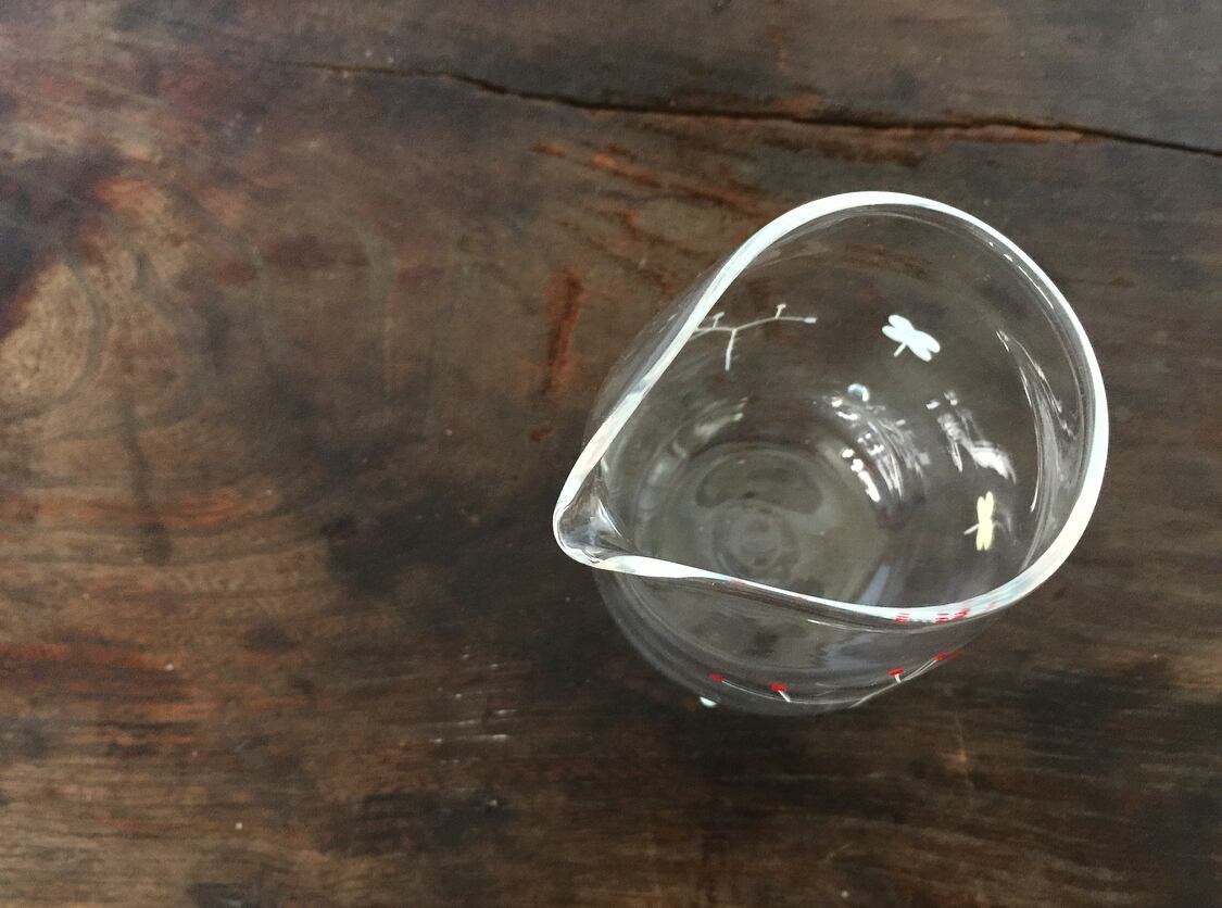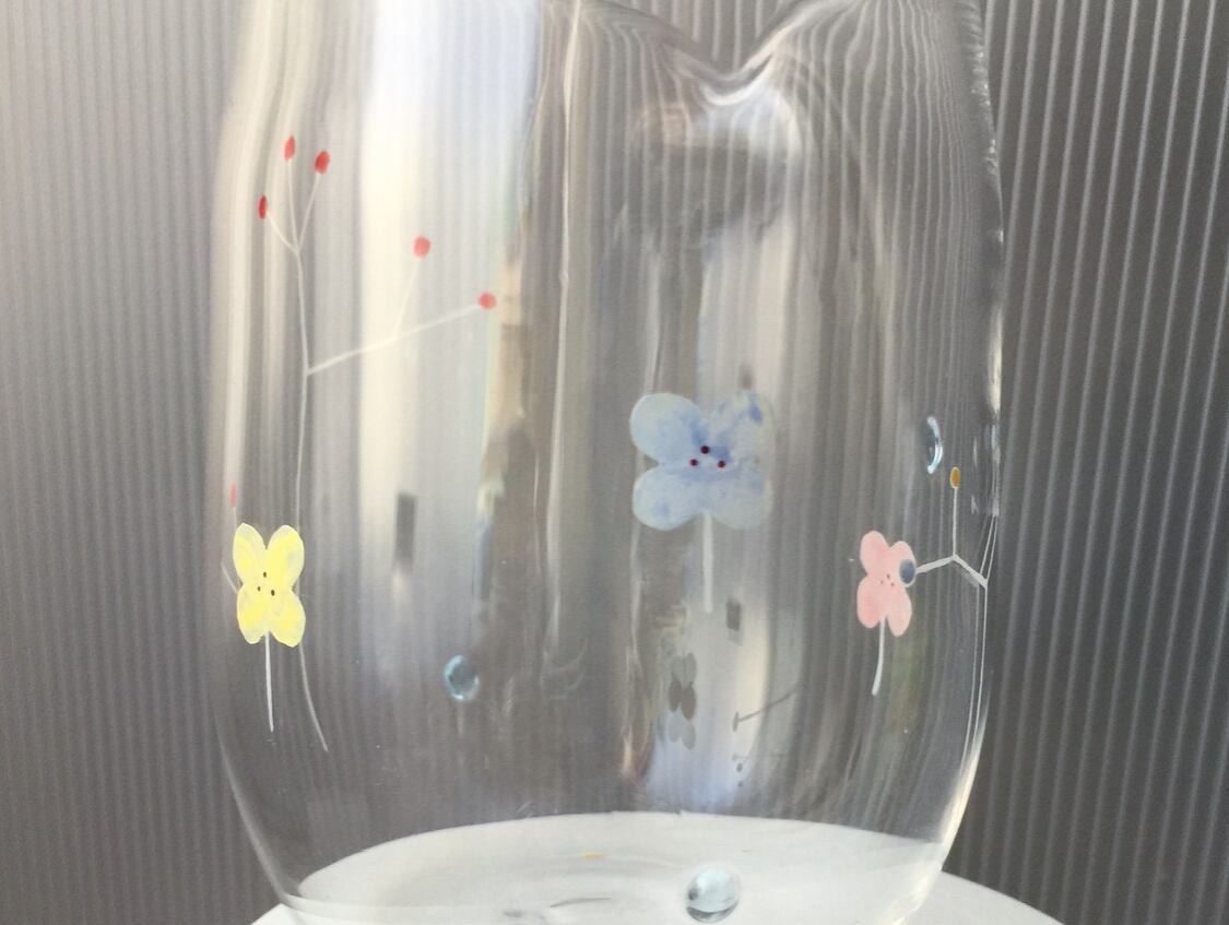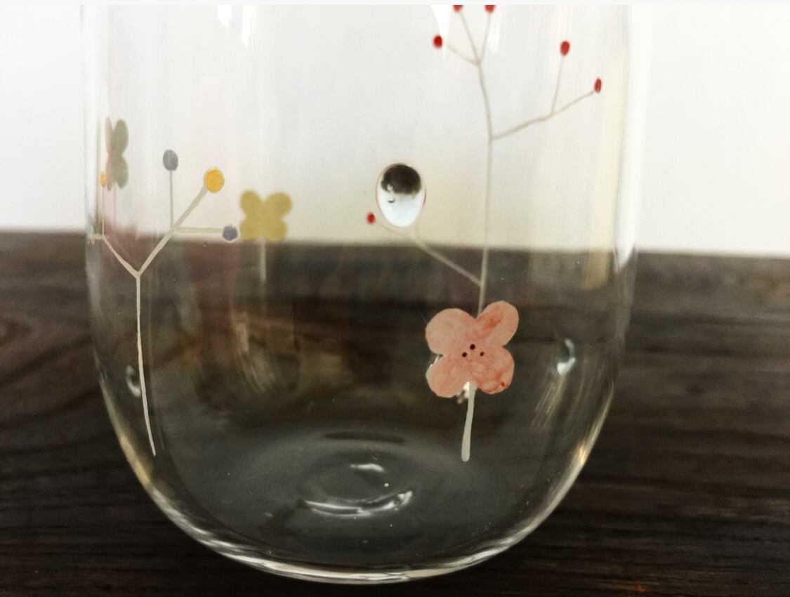 H: 10cm 50℃程度までは入れていただけます。 とても軽やかなグラスです。 素麺等の水差しにいかがでしょう 。 ◯吹きガラスによる作品です。 手仕事なので、少しずつ絵付けやサイズ.フォルムは異なります。 漂白剤はおやめください。