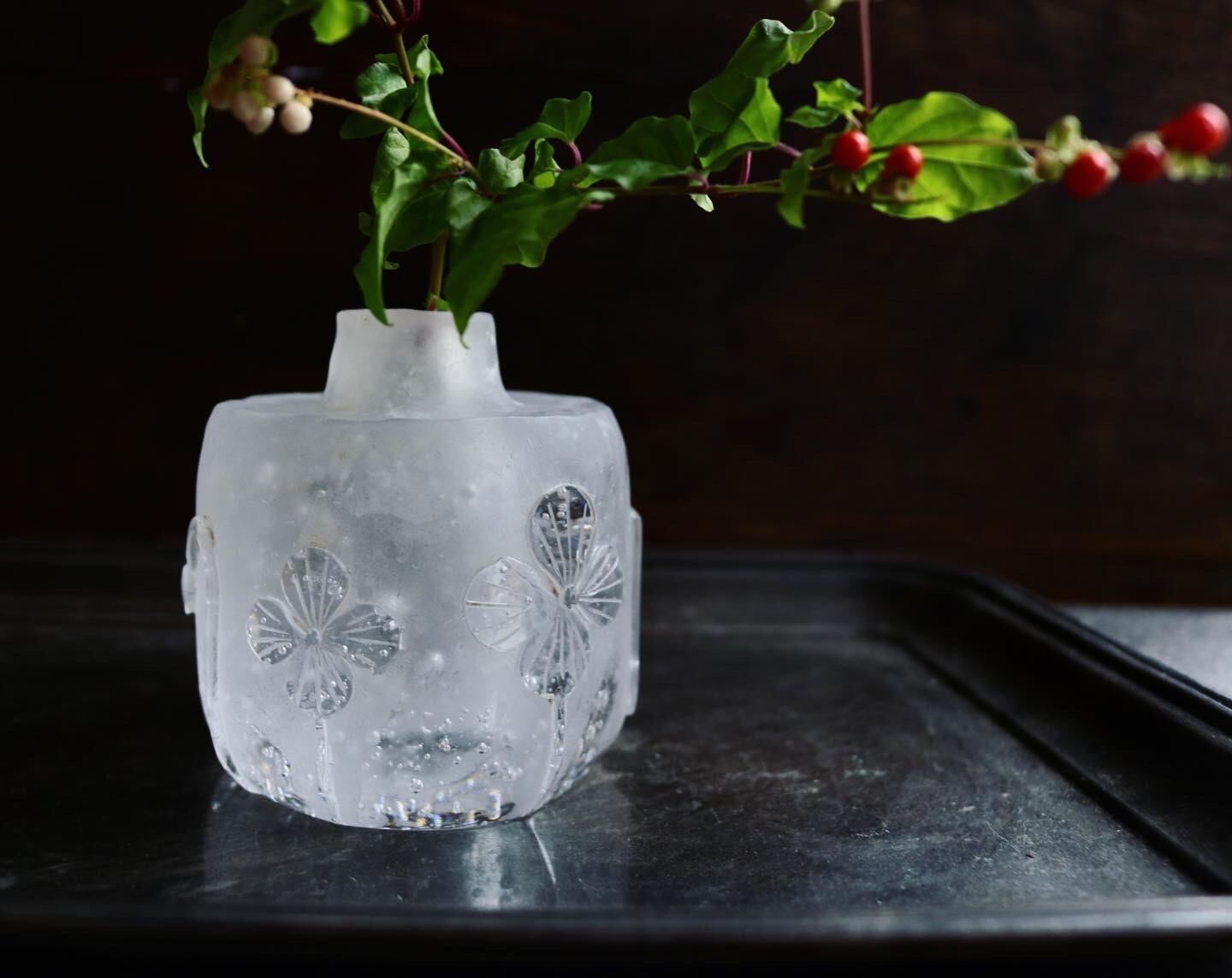 植えた花や風が運んできた植物たち、そんな裏庭の風景をほの明るい透明硝子に。